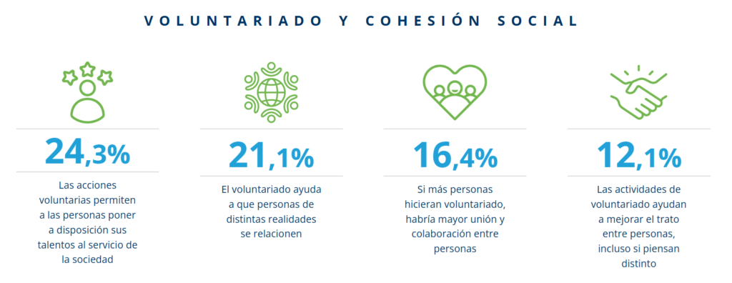 En un contexto social marcado por la división, el voluntariado emerge como un espacio de encuentro: el 21% cree que “ayuda a que personas de diversos orígenes se relacionen”, y el 12% afirma que “mejora el trato con otros, incluso si piensan distinto”.